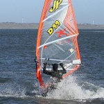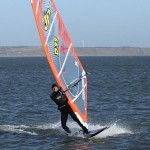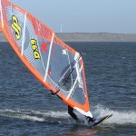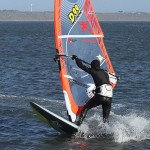 6. The sail should fly over the water held up by the wind, enabling you to get hold of the boom on the other side. Keep applying rail pressure to continue carving into the wind